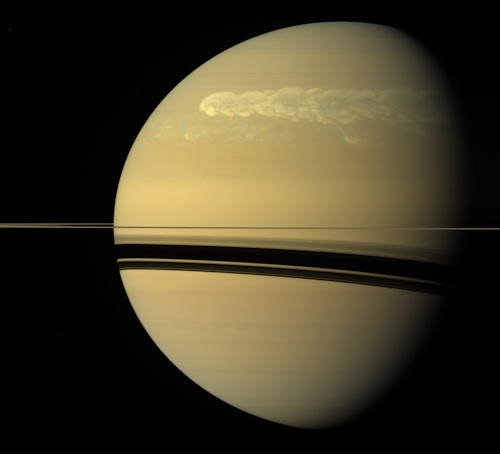 O planeta Saturno e a sua tempestade vistos pela Cassini a uma distância aproximada de 2,164 milhões de quilómetros. Composição em cores naturais obtida pela combinação de 3 imagens captadas a 25 de Fevereiro de 2011 pela câmara de grande angular, através de filtros para o vermelho (648 nm), o verde (567 nm) e o azul (460 nm).
